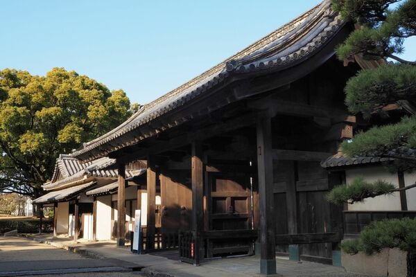 次に、地味な建物ではあるが、山麓の曲輪に御殿表門が残っている。門そのものは豪壮な薬医門形式で、付属の番所と長屋が残っている点でポイントが高い。門も番所・長屋も、取り立てて特徴のない建物だし、美術的価値も高いわけではないから、建築学の先生たちはあまり声高に評価しない。けれども、こうした「普段使い」の建物が城内に残っている例自体が稀少なので、城好き的には必見である。