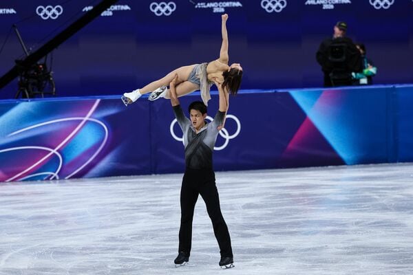 2026年2月16日、ミラノ・コルティナ五輪、フィギュアスケート、ペアで日本初の金メダルを獲得した三浦瑠来・木原龍一組 写真/PA Images/アフロ