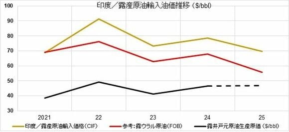 次に、2021年から2025年までのインドの露産原油輸入油価推移を概観します。