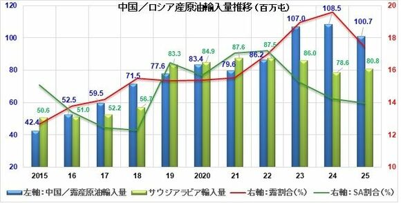 開戦後、中国はESPO原油輸入を拡大。2023年以降のロシア産原油輸入シェアは1位となり、サウジアラビアは2位に転落。ちなみに、中国の2015年から2025年までの露産原油輸入量推移は下記の通りです。