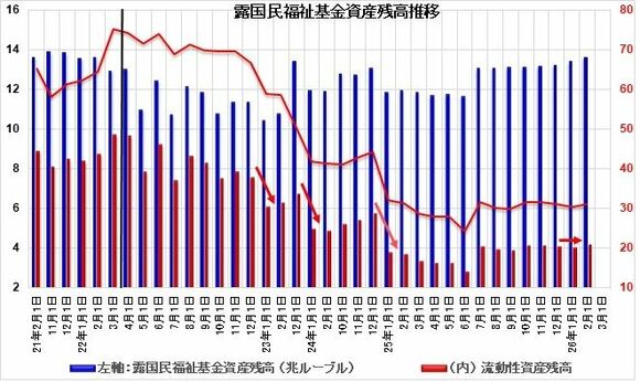 ちなみに、2026年2月1日現在の基金残高は13.639兆ルーブル(GDP比5.8%/1801億ドル相当)、流動性資産残高は4.226兆ルーブル(同1.8%/558億ドル相当)。流動性資産残高の主要内訳は金(Gold)155トン、2011億人民元です。