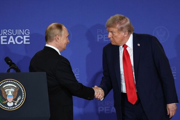 2025年8月15日、アラスカ州アンカレッジで行われたトランプ米大統領(右)とロシアのプーチン大統領の会談(ⒸPresident of Russia Office apai/APA Images via ZUMA Press Wire/共同通信イメージズ)