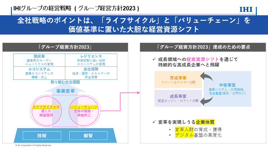 成長事業は、徹底的に投資を行う事業と位置付け、航空エンジン・ロケット分野の1つに絞りました。育成事業は、この先10年程度は短期的な利益よりも事業の立ち上げや育成を重視するもので、グリーンアンモニア事業を選んでいます。そして、育成事業に投資するキャッシュを確保するため、既存事業を中核事業として取捨選択しています。