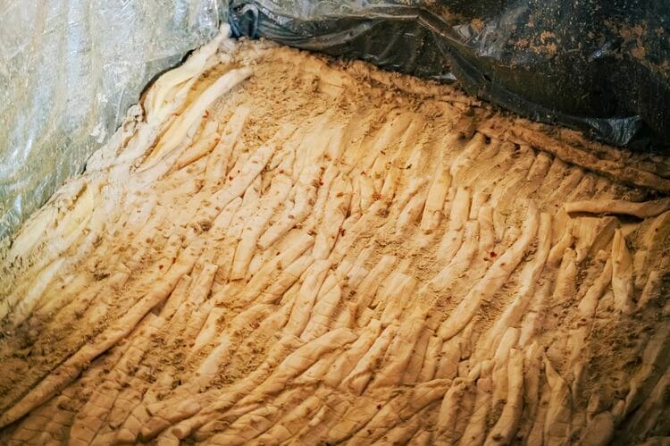 だいこんから出た水分が穴の上、蓋からはみ出し、そこに産膜酵母が形成される。これもある種の蓋になって、その下で乳酸菌による嫌気性発酵が起こることで、だいこんが漬物、つまりたくあんになる。だいこんを隙間なく並べるのも、空気を入れないためだ。