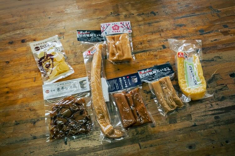 キムラ漬物宮崎工業の商品群(のうちの一部)。たくあんが円柱というよりも四角柱のような形状をしているのがおわかりいただけるだろうか?