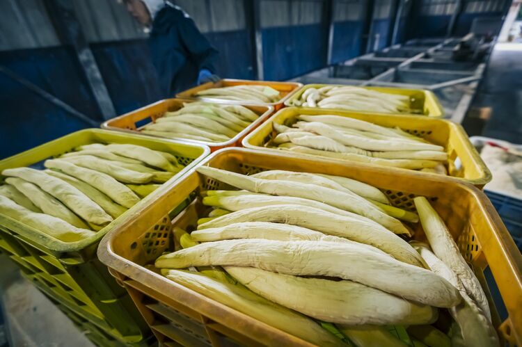 取材日にキムラ漬物宮崎工業に届いただいこん。農家が「大根やぐら」というところで天日干しをしてから納品する。今年は天候に恵まれ、よいだいこんが収穫できたそうだ