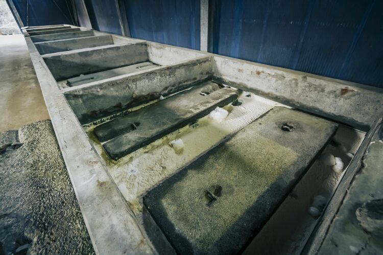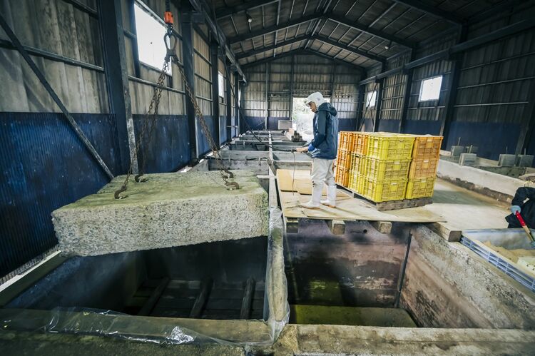1個で1トンもある漬物石を移動させるためのクレーンがあるので、確かに「工業」感があるキムラ漬物宮崎工業の心臓部は、たくあんを作るための巨大な穴。