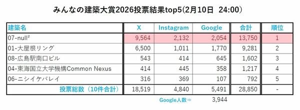 「みんなの建築大賞2026」は、2025年に完成または公表された国内の建築から推薦委員会が選んだ10作品を対象に、X(旧Twitter)、Instagram、Googleフォームを通じて投票を募り、その合計票で大賞を決めるもの。今回の投票期間は2026年2月1日から10日までの10日間で、投票総数は2万8850票だった。そのうち、大賞の「null²」が1万3750票、次点の「大屋根リング」が9281票。この2作品で投票総数の約8割を占め、3位以下を大きく引き離した。