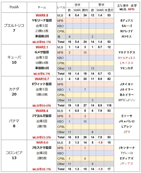 今回のWBCの第1ラウンドは、プールA、プールB、プールC、プールDの4つのグループ各5チーム(国)でリーグ戦を行い、上位2チームがトーナメント形式の決勝ラウンドに進む。以上のことを踏まえて、各プールごとに各国の戦力比較を試みよう。