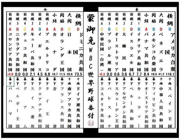 最後に、今回のWBCの「世界野球番付」を作った。幕内はWARの順番、十両は今回の予選に出場した4カ国、幕下にはWBSCランキングの上位を並べてみた。