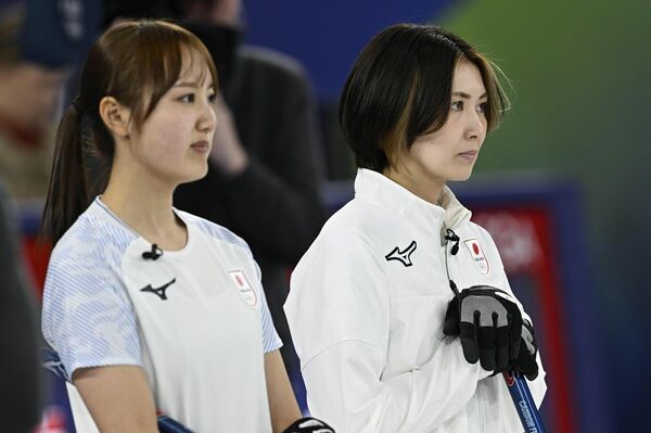 ミラノ・コルティナ五輪女子カーリング、日本―イタリア戦の第7エンド、厳しい表情を見せるフォルティウスの吉村紗也香(右)と小林未奈=コルティナダンペッツォ(写真:共同通信社)