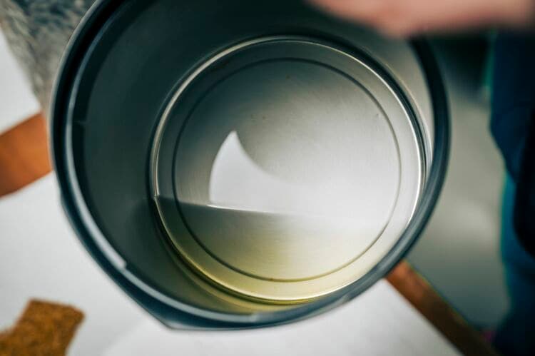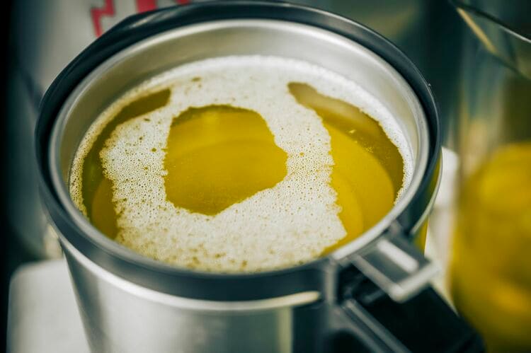 搾りたての油には空気が入っているほか、若干の雑味がある。これらを時間をかけて活性炭のフィルターで濾過することで取り除いて完成