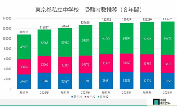 まず、首都圏だけでなく全国で最も中学受験生が多く、受験率も高い東京都の実受験者数は、前年に続き今年も増加しました。