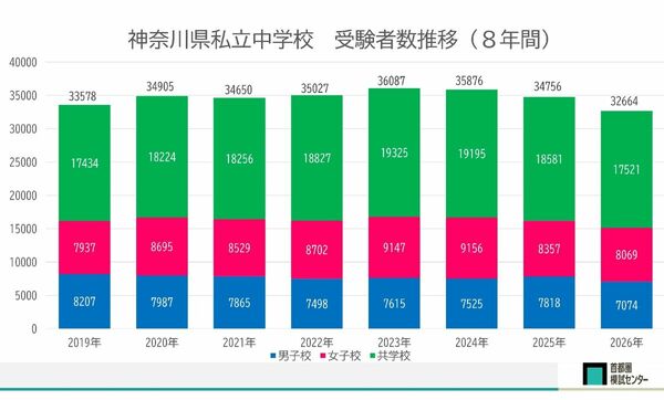 隣接する千葉県、埼玉県はほぼ横ばいでしたが、今年特に目立ったのは、神奈川県の受験生の減少でした。東京都の増加分を、神奈川県の減少分が相殺して、さらに全体の減少につながったという見方ができます。