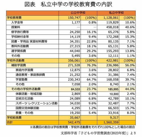 では、具体的に私立中学に入学するとどんな費用がかかるのか「子供の学習費調査(2023年度)」を元に「学校教育費」の支出構成を見てみましょう。