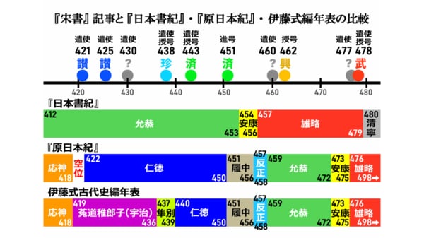 伊藤:結論としては、済は仁徳天皇、興は允恭天皇で、武は通説通り雄略天皇だと私は考えています。これは、あくまでも無事績年削除法によって機械的に復元した原日本紀の編年からの推定です。