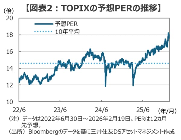 2025年の日本株の動向を振り返っても、日経平均株価は年間に約26.2%上昇、TOPIXは約22.4%、そして、電線株を含む非鉄金属株は100%を超える高パフォーマンスを記録しました。その一方で、①昨年4月にはトランプ関税ショックにより市場は大幅な調整に見舞われ(図表1)、②予想株価収益率(PER)は過去平均から上振れした「割高状態」が続き(図表2)、そして、③世界の株高をけん引してきた米国のAI関連株についてはデータセンターへの過剰投資が問題視されるようになるなど、「売る理由」に事欠かない年であったのも事実で、手練れのプロ達でも頭を悩ませる難しい相場展開でした。