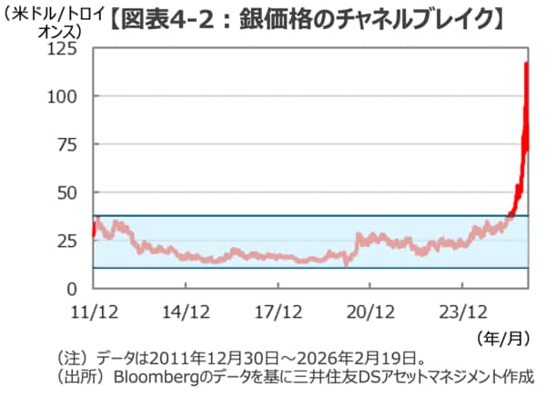 まず、①世界中の様々な投資市場の中から、値動き、出来高、流動性などから投資先を選びます。例えば、短期の移動平均が長期の移動平均を上に突き抜けるゴールデンクロスが生じていて(図表4-1)、最近のトレーディングレンジを上に突き抜ける動き(チャネルブレイク)がみられ(図表4-2)、出来高が増加中であり、ポジションをとるのに十分な市場規模・流動性がある投資対象を選びます。