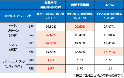 直近3年間のトータルリターンを見ると、日本高配当株ファンドは日経平均株価・TOPIXより劣りますが、5年ではダントツです。リスクを抑えられており、リスク効率を見ても日本高配当株ファンドがベターだとわかります。