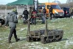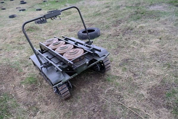 昨年4月、ウクライナの防衛技術イノベーションを支援する政府機関「Brave1」が実施したロボット試験に登場した無人陸上車両(写真:Ukrinform/共同通信イメージズ)