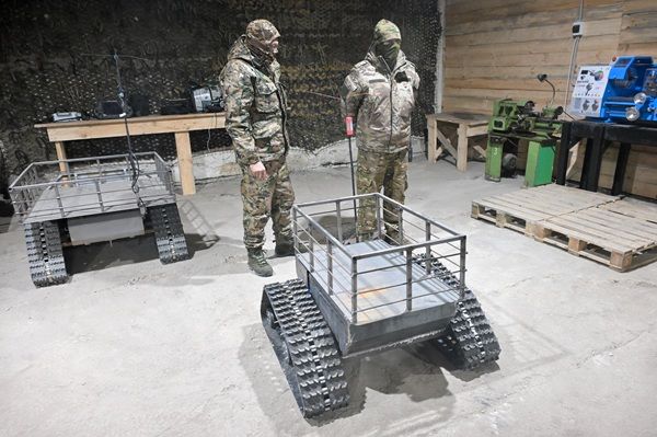 こちらはロシア軍のUGV。ロシア・ルガンスク人民共和国にあるザパド(西)軍集団第92工兵連隊でシステム改良中のロボット(写真:Sputnik/共同通信イメージズ)