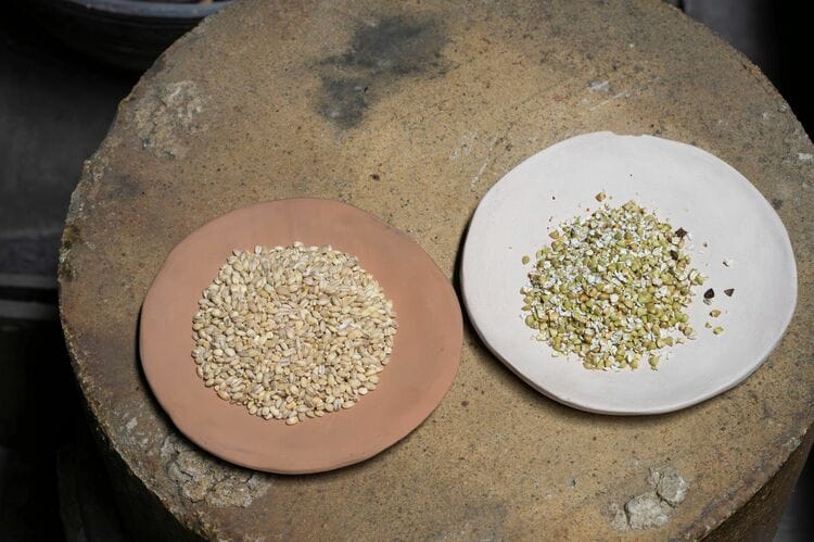 麹作りに使う蕎麦と大麦。蕎麦は新潟・小千谷市の有機栽培。大麦はコラボしている福岡の焼酎蔵のもの