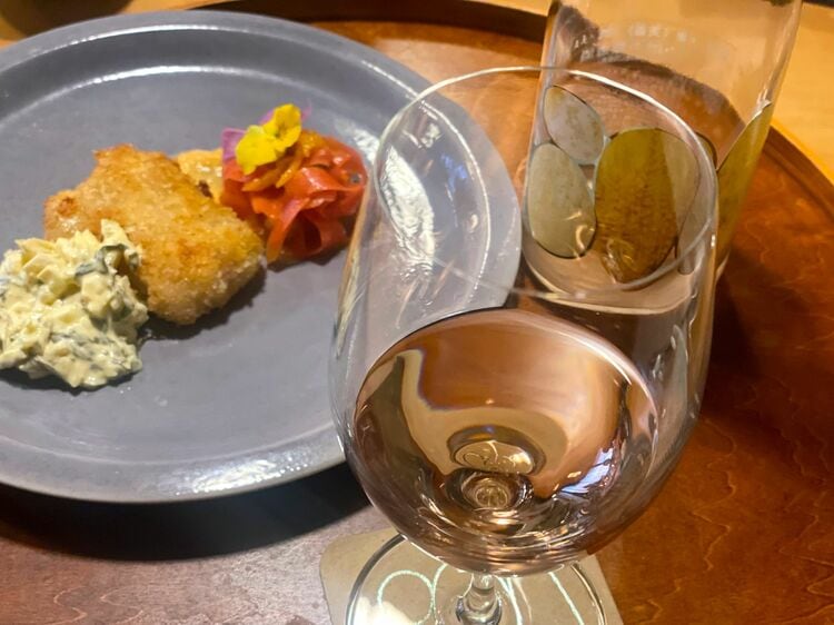 福岡県の焼酎蔵とのコラボレーション「800 大麦〈天盃〉」は、世界初の「純麦酒」だ。麦のふくよかさがパンチのある料理を支える。「そ・かわひがし」(京都市左京区)で1月に開催された、LINNÉペアリングイベントでは、豚・カマンベールチーズのフライに合わせた。LINNÉペアリングイベントは4月にも開催予定(撮影:著者)