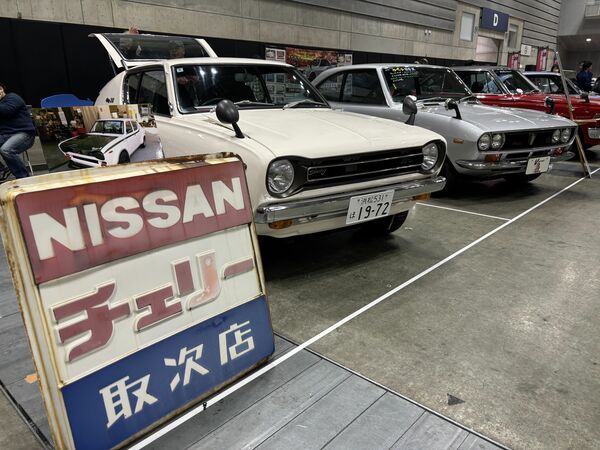 1970年代の日産販売店を懐かしむ展示。後方に「チェリー」を展示(写真:筆者撮影)