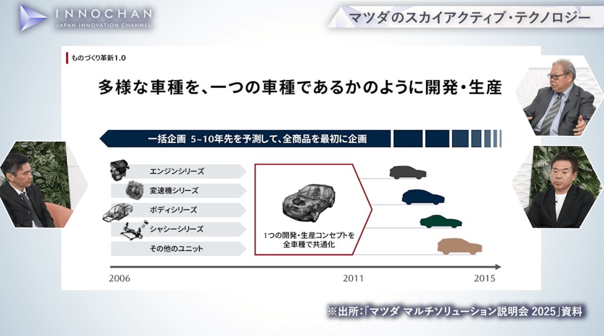 池田 マツダはフォードとの資本提携を解消した際に、プラットフォームを引き上げられました。当時もマツダは年産130万台程度でしたが、世界市場に対応するには9車種を展開せざるを得ませんでした。そこで基礎設計を共用しながら異なる商品を作る「一括企画」と、混流生産で作り分けるというゴールにたどり着いた。それが広くスカイアクティブと呼ばれている技術です。