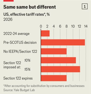 エール大学予算研究所の推計によれば、最高裁判決前の米国の実効関税率は13.7%だった。IEEPAによる関税が通商法122条に基づく15%の関税と置き換えられれば、実効関税率は若干下がって12.2%になる(図1参照)。