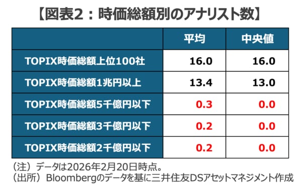 多くの小型株はそもそも機関投資家や証券会社の調査対象となっていないことも多く(図表2)、会社の業績や内容が正しく理解・評価されていない銘柄も少なくないようです。そして、一部の投資家が本来の価値に気付いて買い始めると、株価は大きな動きを見せることが少なくありません。