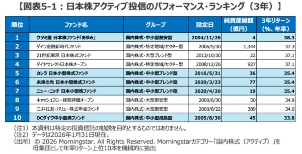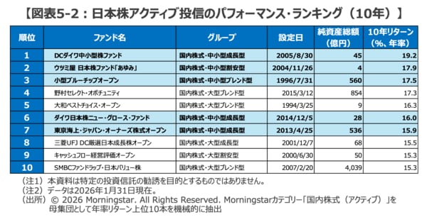 「銘柄選択のプロ」と小型株の相性の良さは、日本株投信のパフォーマンス・ランキングからも確認することができます。過去3年(ファンド総数628本)及び、10年(同449本)のランキングを見ると、いずれの期間でも上位10ファンド中、半分の5本が中小型株ファンドとなっています(図表5-1、5-2)。