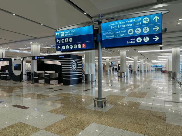 2日午前、全便が運行を停止し、閑散としていたドバイ国際空港のロビー。同空港もドローンによる攻撃を受け、4人の負傷者が出た(2026年3月2日撮影)