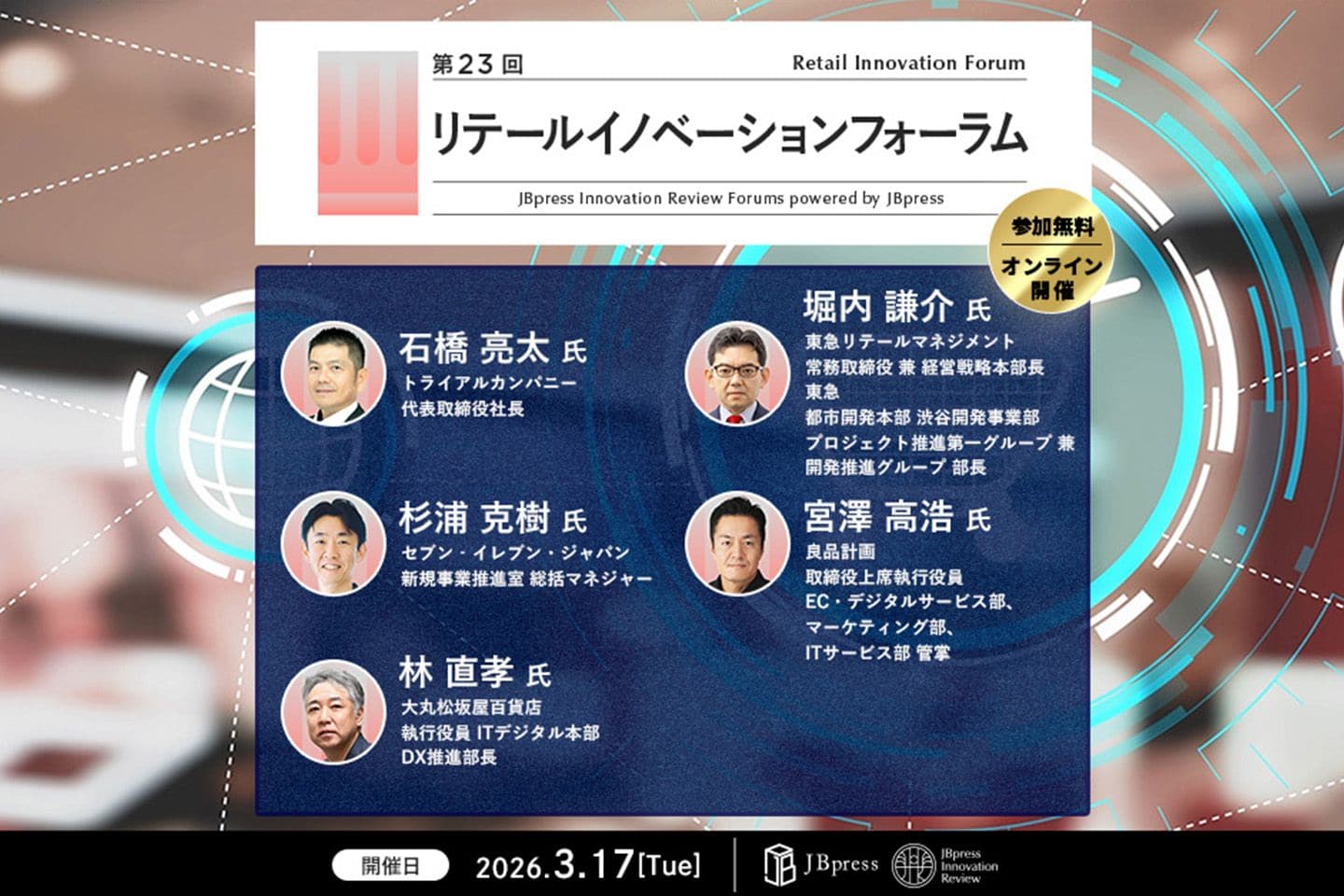 JBpress/JBpress Innovation Reviewでは3月17日(火)に「第23回 リテールイノベーションフォーラム」を開催します。本セミナーでは、トライアルカンパニー 代表取締役社長 石橋亮太氏が初登壇。顧客データ活用を軸にした価値創出の全体像に加え、AI内製化による業務変革や、メーカーや卸を巻き込んだ「共創エコシステム」の取り組みについて解説します。また、東急リテールマネジメント 常務取締役 兼 経営戦略本部長 堀内謙介氏が登壇。2025年4月、東急(株)グループの商業施設運営子会社6社を傘下に置く事業統括会社として誕生した同社について、再編の狙いと今後の展望を語ります。そのほか、セブン‐イレブン・ジャパン 新規事業推進室 総括マネジャー 杉浦克樹氏による講演や、前回開催時に好評だった良品計画 取締役上席執行役員 宮澤高浩氏、大丸松坂屋百貨店 執行役員 ITデジタル本部 DX推進部長 林直孝氏によるセッションも再配信します。どうぞお見逃しなく。