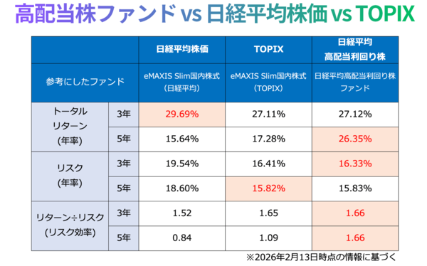 頼藤:3年だと日経平均株価がいいですが、5年で見ると圧倒的に日本の高配当株投資の方が良いことがわかります。リスクも比較的抑えられていて、リスク効率もいい。
