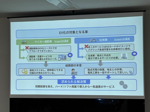 SSBJ基準を考慮した社用車とマイカー通勤車のEV対応を考慮したTerra Chargeの説明図(写真:筆者撮影)