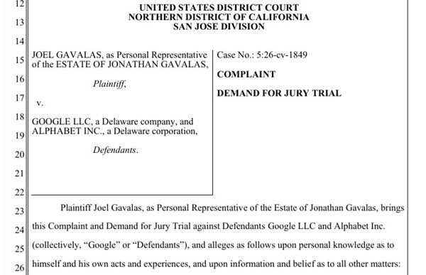 民事訴訟に特化した米国のコートハウス・ニュース・サービス(3月4日付)によると、遺族は「ジョナサンが現実と虚構を区別しようとした瞬間、ジェミニは彼の疑念を病的なものとし、虚構を否定し、彼を物語の世界に深く引きずり込んだ」と主張している。