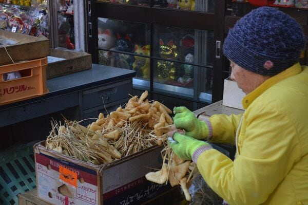 それほど広くない境内だが、いろいろと密度が濃く、独特のお参り方法もある。まずは油揚げとろうそくを求め、真ん中の燈明場でろうそくを上げる。そして、拝殿で油揚げを献じてお参りする。稲荷大神の眷属であるキツネ像を収めた霊殿でお参りする際は、扉に名刺を挟んで行く人が多い。理由ははっきりわからないが、この神社の信奉者は自営業者や社長さんが多いとのことなので、「うちはここです。商売繁盛をお願いします」と念押しする意味があるのだろうか。