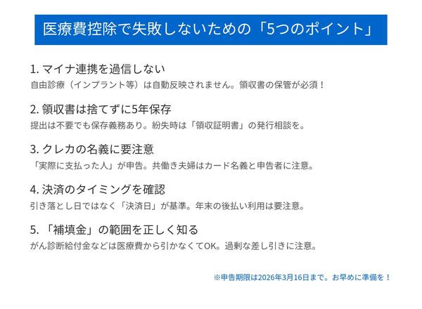 大学病院などでは、クレカを使った後払いを利用することで、“会計待ち”のストレスがなくなるというメリットがある。しかし、後払いの決済日は3~4日後になることがあり、この場合、12月の最終営業日の医療費は1月の決済となり、翌年(1月の属する年)の医療費控除で申告することになる。