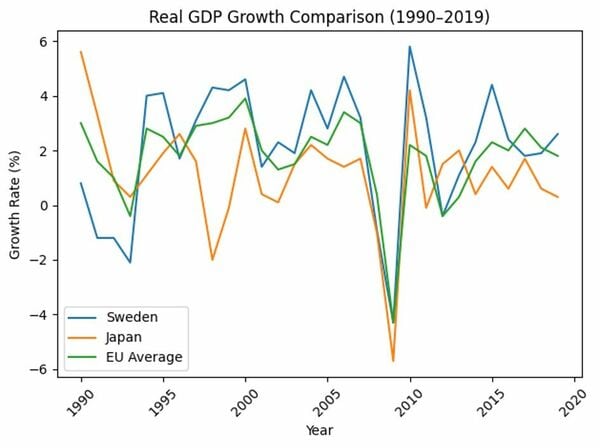 上のグラフから、この時期、スウェーデンはEUや日本を上回って成長しているのがわかる。EU平均は概ね1〜3%レンジで推移し、日本は1990年代以降、低成長となり、いわゆる「失われた30年」に突入していた。
