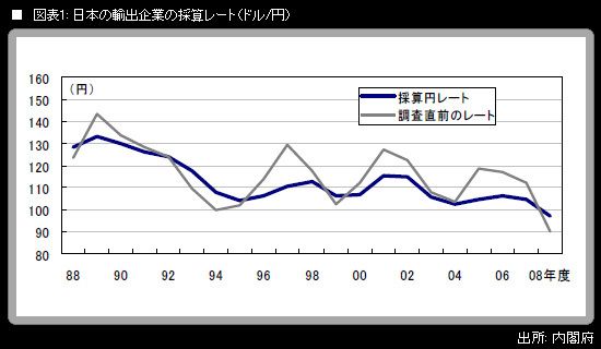 今回明らかになった輸出企業の採算レート(ドル/円)は、1ドル=97.33円となった(統計結果表にあるコンマ以下2ケタの数字。調査報告の本文では97.3円と表記されている)。2007年度調査の104.74円から、円高方向に大きく動いた。採算レートが100円割れとなったのは、調査開始以来初めてのことである。調査直前の1月時点の市場実勢は90.4円だったので、輸出企業はその頃、採算割れ状況に陥っていたことになる。足元の市場実勢は98円台で、採算円レートよりはやや円安の水準にある。いずれにせよ、日本の輸出企業が為替差益を期待できるような市場環境ではない。