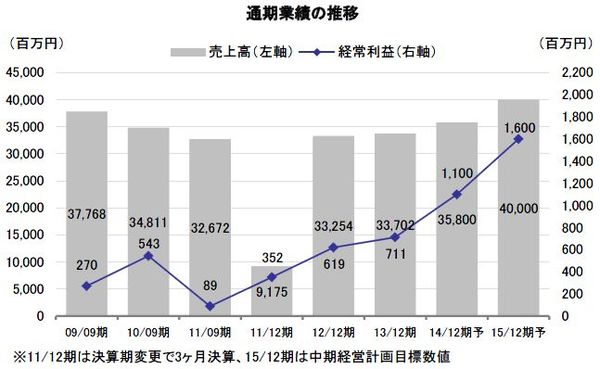 同社は2013年12月期より、2015年12月期を最終年度とする中期経営計画に取り組んでいる。中期経営計画最終年度の数値目標は、売上高が2013年12月期比で6,300百万円増の40,000百万円、経常利益は同900百万円増の1,600百万円を目指す。売上面では優良なブランドポートフォリオを活かし、参入障壁が高いサービスエリアや道の駅などの受託ビジネスを拡大させ、利益面では直営ビジネスの主力4ブランドを核にした高付加価値戦略で利益率の向上を目指す方針である。