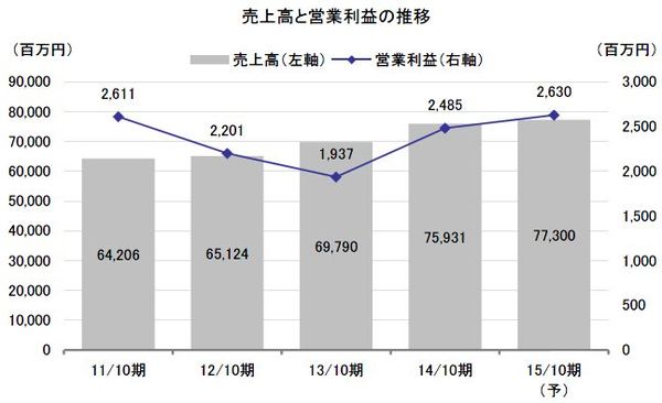 2014年10月期の業績は、売上高が前年同期比8.8%増の75,931百万円、営業利益が同28.3%増の2,485百万円、経常利益が同25.0%増の2,835百万円、当期純利益が同26.2%増の1,663百万円となった。売上高、各利益ともに期初予想を上回り、商品別では特に電力用ケーブル、非電線が好調であった。