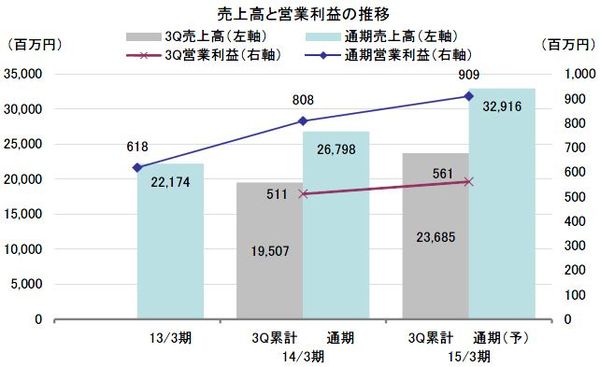 2015年3月期の第2四半期連結決算は、売上高が前年同期比22.2%増の15,185百万円、営業利益が同13.3%増の335百万円、経常利益が同16.5%増の341百万円、四半期純利益が同25.3%増の189百万円となった。第2四半期ベースでの増収・増益は5期連続、売上高、利益とも創業以来の過去最高を更新した。期初計画比では、売上高が0.1%の上振れとなったほか、営業利益が80.1%、経常利益が83.3%、四半期純利益が170.0%の大幅な上振れとなった。