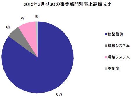 2015年3月期の第3四半期の業績は、売上高122,653百万円(前年同期比13.3%増)、売上総利益9,678百万円(同4.2%増)、営業損益は1,504百万円の損失(前年同期は1,986百万円の損失)、経常損益は713百万円の損失(前年同期は1,552百万円の損失)、四半期純損益は207百万円の損失(前年同期は924百万円の損失)となった。一部不採算工事の発生により工事損失引当金を積み増したことなどから上半期(第2四半期累計)の損益は前年同期を下回っていたが、第3四半期業績は好調に推移、第3四半期累計では前年同期を上回る決算となった。なお、同社の業績は、工事の完成引渡しが年度末に集中する影響で、売上高・利益額が第4四半期に偏る季節要因がある。
