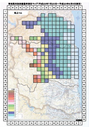 「南相馬市放射線量率測定マップ(平成23年7月20日~平成23年9月5日測定)」より。薄い水色は放射線量が低く、茶色やオレンジ色の場所は線量が高い。