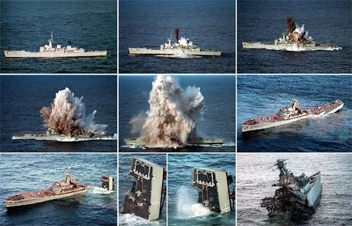 現代の魚雷による艦船の破壊(出所:Wikipedia File:Mark 48 Torpedo testing.jpg)