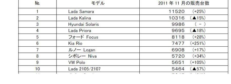 ロシアで急増中の日本マニアとオタクを狙え! 表1:ロシアの新車販売速報(2011年11月)(ロシアNIS貿易会 MoscowBusinessNewsより) (画像1/6) ハイパーマーケット「アシャン」のずらりと並んだレジ、多いところでは100台ものレジが同時稼働していて、圧倒される (画像2/6) モスクワ郊外にある自動車部品市場にて。部品の種類ごとに店が分かれているのが特徴で、この写真はゴムベルト専門 (画像3/6) J-Festでコスプレに出演した友人の姿をカメラに収めるカメラ女子。こういう姿のティーンたちが大変目立ったのも今年の特徴だろう (画像4/6) J-Festのヤマハブースで大活躍中のヤマハミュージックロシアの猿谷社長。ヤマハの楽器に触れられるとあって、大勢のファンがブースに来場していた (画像5/6) ヤマハ、ガラコンサートで演奏したJ-Popバンドコンテスト入賞バンド。JK(女子高)ファッションに身を包み、歌詞もすべて日本語。ロシアの若者がここまで日本をフォローしていることに驚く (画像6/6) ロシアで急増中の日本マニアとオタクを狙え! この写真の記事を読む