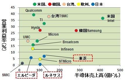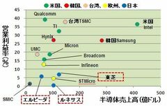 図3 2010年の売上高と営業利益率(ガートナーのデータおよび各半導体メーカーのHPのデータを基に筆者作成)