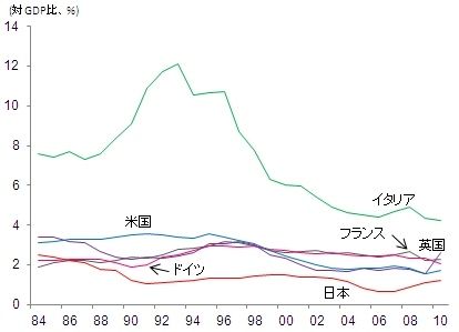 政府利払い対GDP比の国際比較  出所:OECD(経済協力開発機構)、武者リサーチ